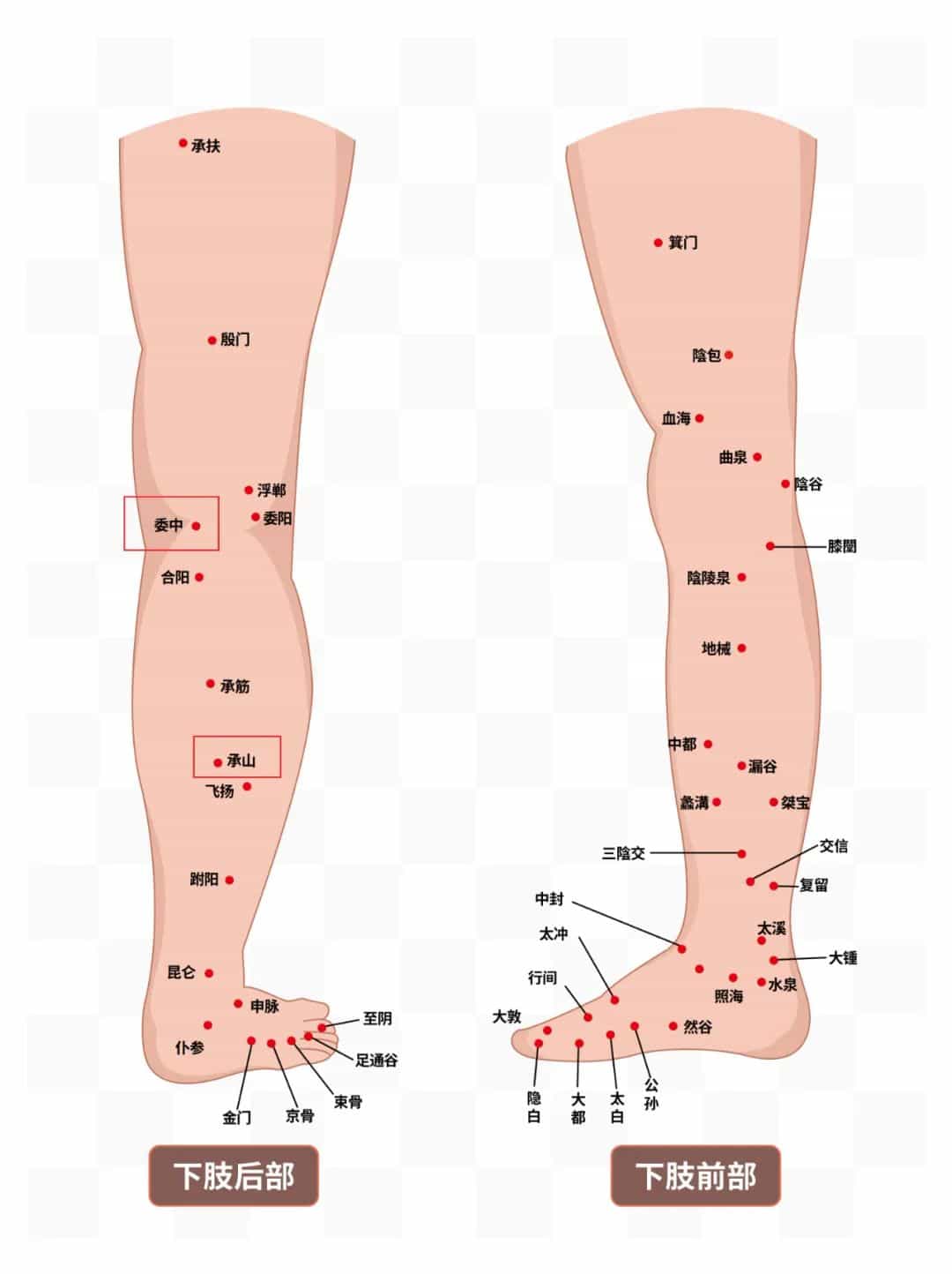患者俯臥,他人幫忙按揉委中穴(膝關(guān)節(jié)后方腘窩正中)、承山穴(小腿后面正中),以局部有酸脹感為宜,每側(cè)穴位操作2~3分鐘,有腰部熱流感、舒適感。