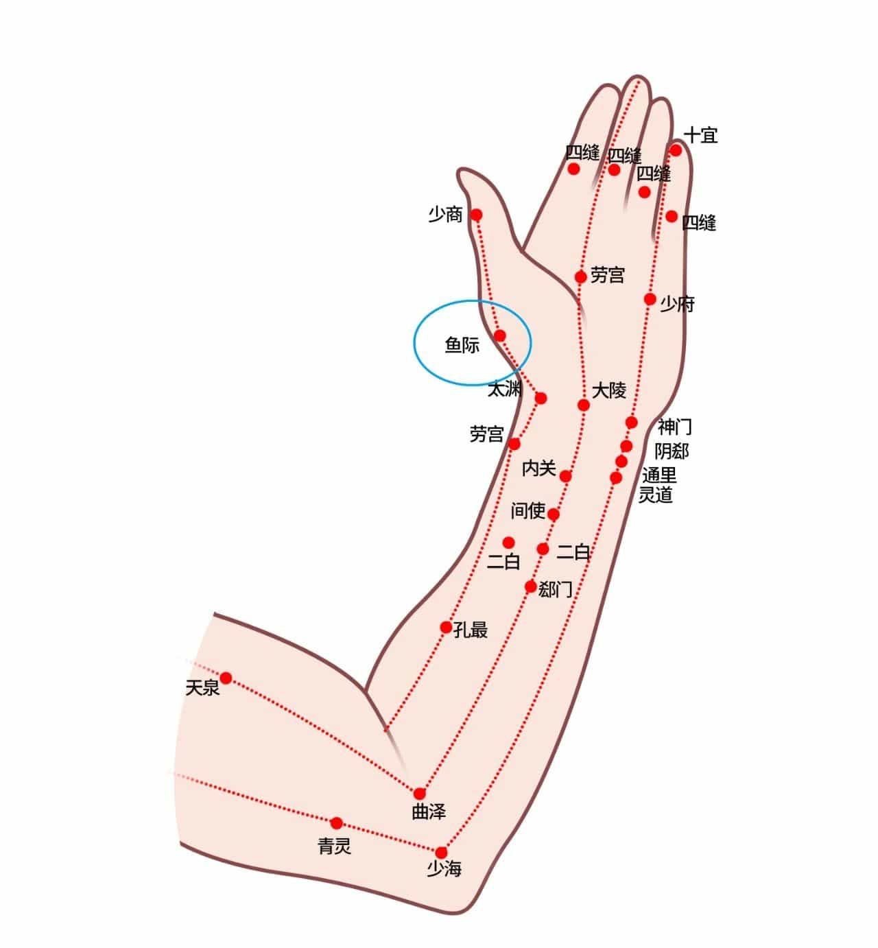 古籍中記載“滎主身熱”,魚際穴具有清肺熱、泄陰火、清熱利咽的功效。