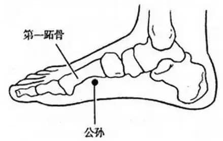 公孫穴的位置位于跖趾關(guān)節(jié)第一關(guān)節(jié)內(nèi)側(cè),往后輕推到達(dá)足弓,在弓形骨后端下緣,可以觸及一個凹陷,按壓有酸脹感,這就是公孫穴。