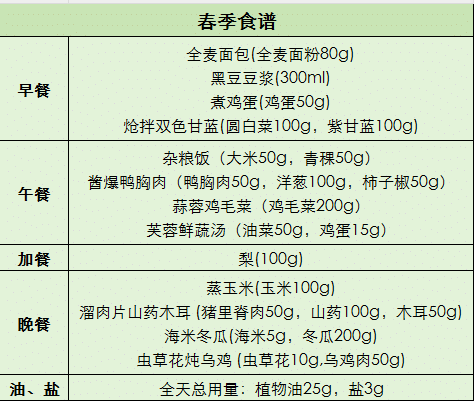 按照《指南》的基本原則,根據(jù)各地食物資源和人群膳食特點(diǎn),推薦不同地區(qū)、不同季節(jié)的糖尿病患者適用的全天膳食食譜。依據(jù)《指南》為大家推薦一些適合輕體力活動(dòng)成人糖尿病患者的四季食養(yǎng)食譜。
