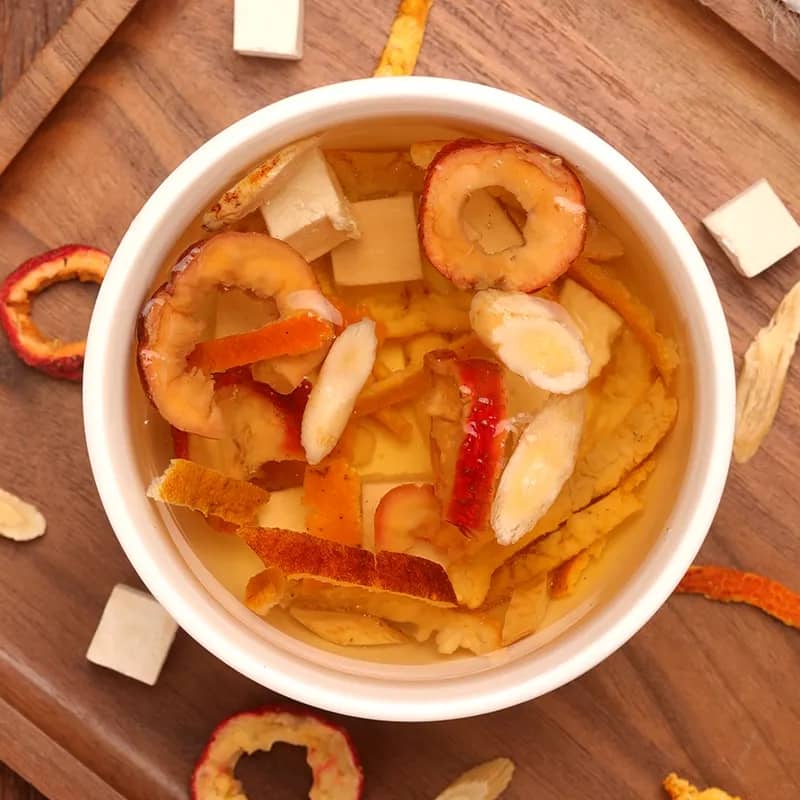 【配方】:陳皮10g,桔梗10g,桑葉10g,凈山楂10g,甘草10g,魚(yú)腥草10g,羅漢果半個(gè),冰糖適量。